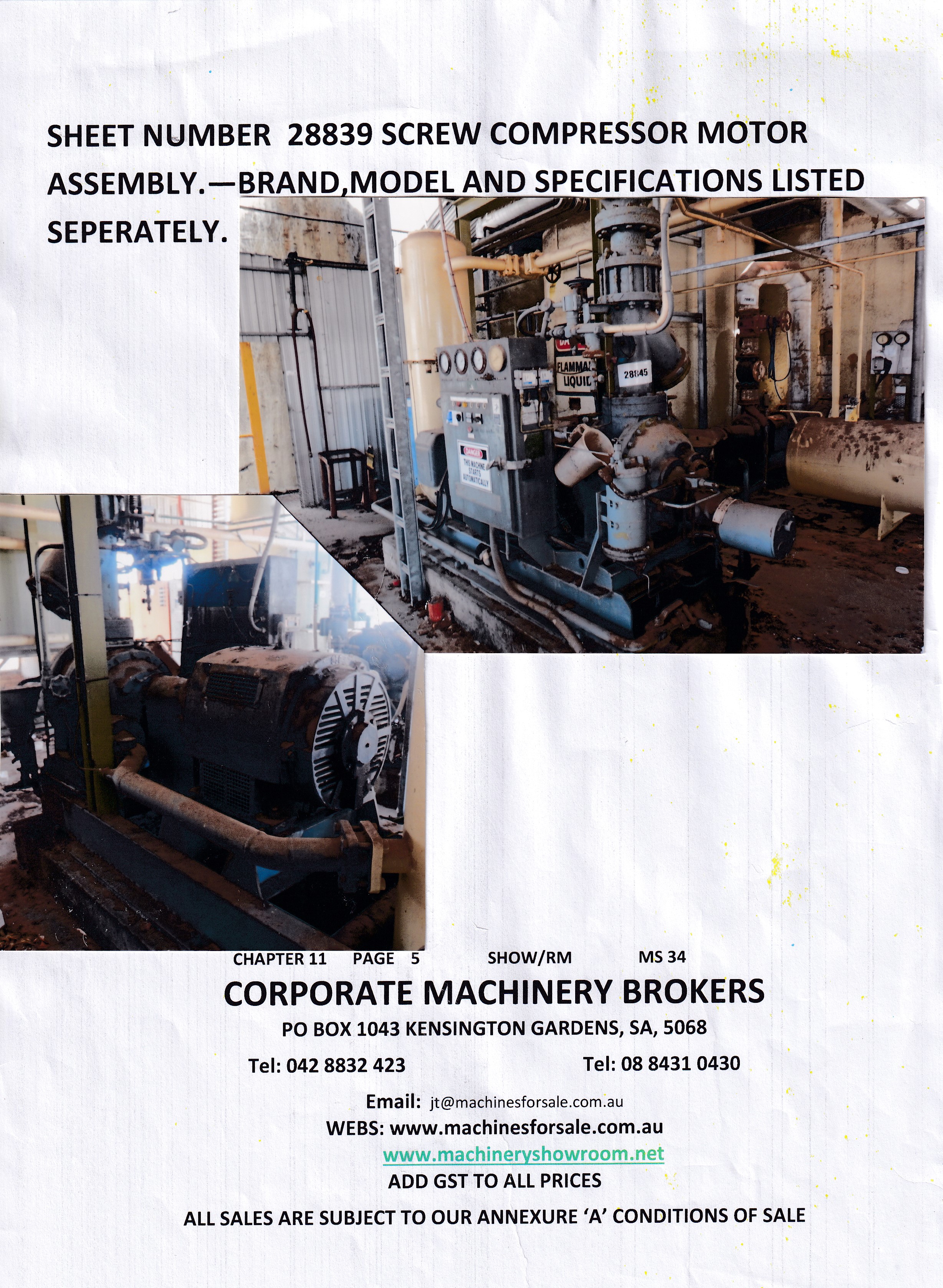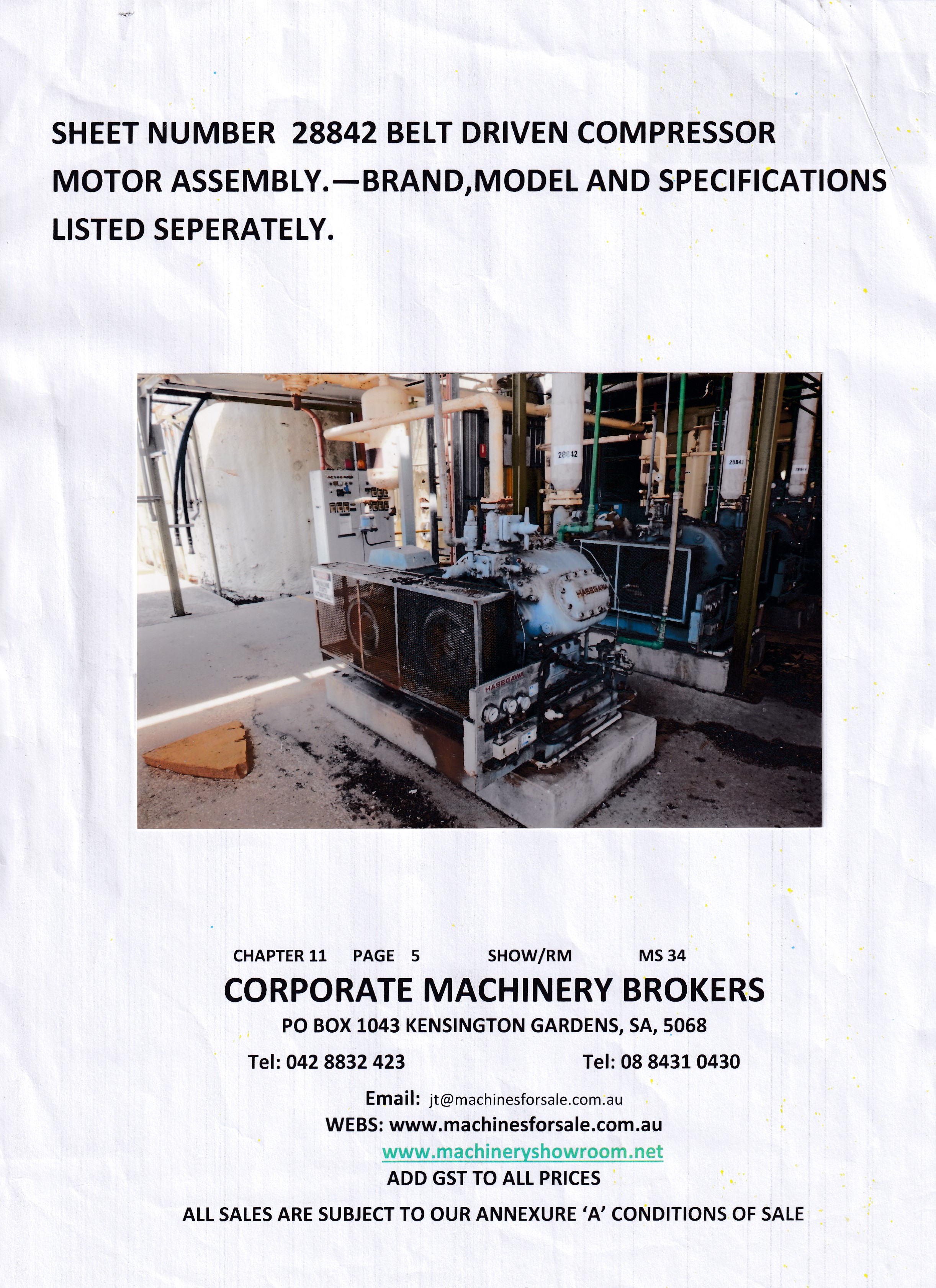 PG.5-COMPRESSORS ACCESSIBLE SEALED / BELT DRIVEN COMPRESSORS--RECIPROCATING 28840 COMPRESSOR MOTOR ASSEMBLY HASEGAWA-SURELY MODEL VM2336--NH3 28841 COMPRESSOR MOTOR ASSEMBLY HASEGAWA-SURELY MODEL VM2336--NH3 28842 COMPRESSOR MOTOR ASSEMBLY HASEGAWA-SURELY MODEL VML3A---NH3 28839A COMPRESSOR SCREW ASSEMBLY SULLAIR MODEL C 20SA 3.7.71---NH3 SEALED./ALTERNATIVELY .